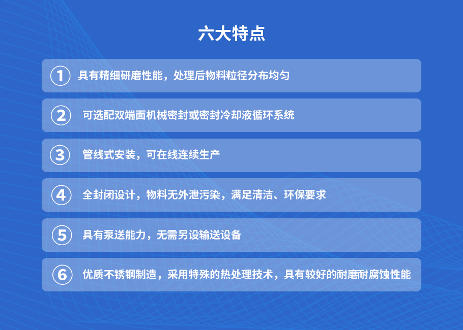 GSM型湿法粉碎研磨机的定、转子工作表面由不同角度的细槽构成,并通过外部手柄可在线调节定、转子工作表面的相对间隙。转子旋转产生的高切线速度和高频机械能,使物料能同时完成粉碎、研磨、分散、乳化、均质、输送。粉碎研磨细度可小于10(μm)。